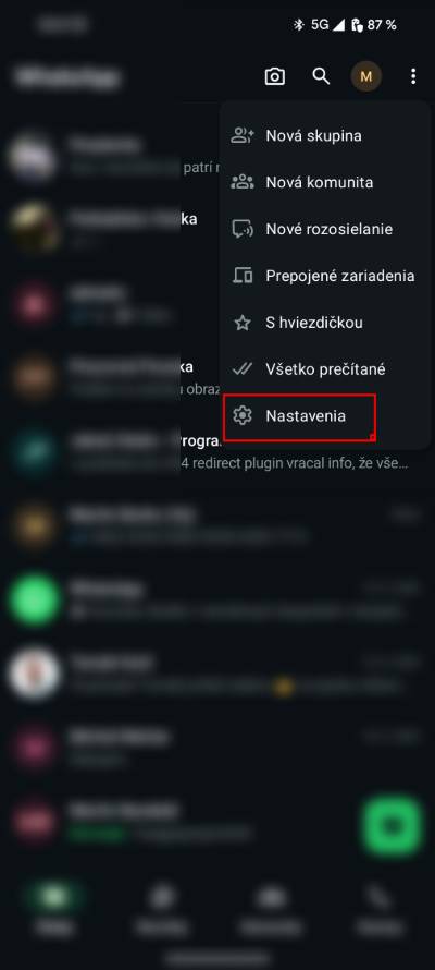 - Otevři WhatsApp a klikni na tři svislé tečky v pravém horním rohu.
