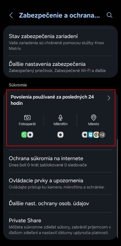 Později, jak budeš používat telefon, tak v této sekci se ti bude tvořit záznam oprávnění, která aplikace použily. Například, když otevřeš aplikaci WhatsApp a uděláš v ní videohovor, tak se v záznamu učiní záznam, že aplikace přistupovala ke kameře telefonu. Když s jinou aplikací budeš přistupovat k SMS zprávám, tak se to rovněž ukáže v záznamu.
