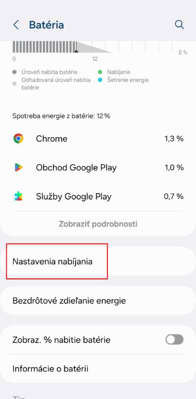 - Vyhledej sekci Nastavení nabíjení.