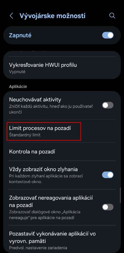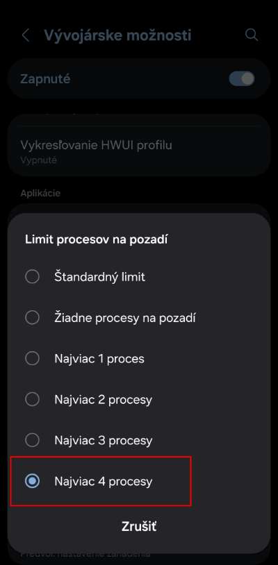 V nastaveních pro vývojáře chvíli zůstaneme. Přináší totiž výhody omezit počet aktivních procesů na pozadí. Standardně Android nechává běžet i více než 20 procesů, ale ty je můžeš snížit, například jen na 4. Uděláš to jednoduše přes nastavení limitů procesů, které najdeš právě v Režimu pro vývojáře. Stačí si vyhledat možnost „Limit procesů na pozadí“ a zvolit například 4 procesy nebo dokonce „Žádné procesy“, pokud chceš jít na maximum.
