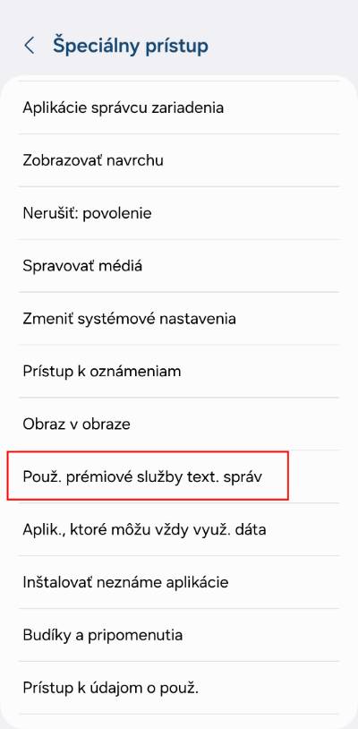 - V rámci těchto povolení najdi možnost Využití služeb prémiových zpráv SMS. Když otevřeš tuto kartu, uvidíš aplikace, které tě mohou přihlašovat k tomuto typu služeb.