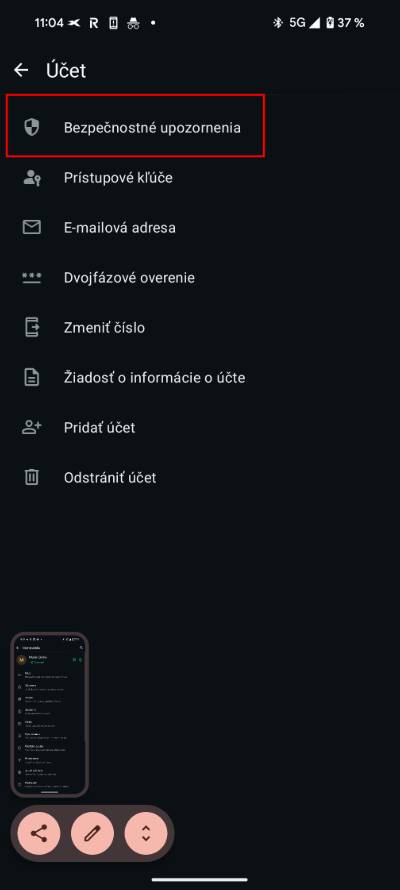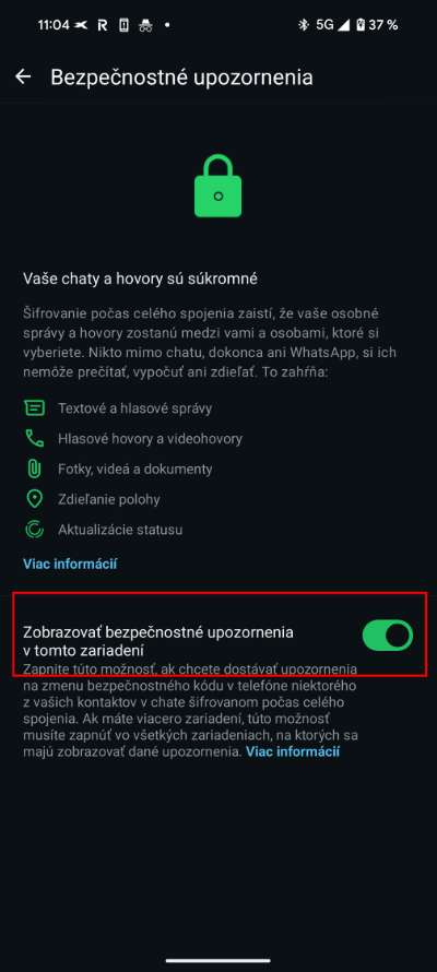 Možná se teď ptáš, co vlastně tato funkce dělá. Když osoba na druhé straně změní telefon, změní se i šifrovací klíč v chatu. A právě na toto tě tato funkce upozorní.
